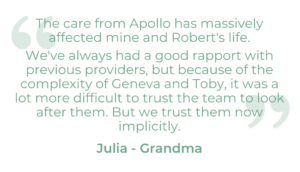 Our nurse-led approach gives Geneva and Toby the chance to stay where they belong, at home, surrounded by the people who love them most. With specialist support from their dedicated Apollo Home Healthcare Nurse, and clinical oversight from our Clinical Nurse Specialists, every aspect of their care is carefully managed to keep them safe, comfortable, and happy.
